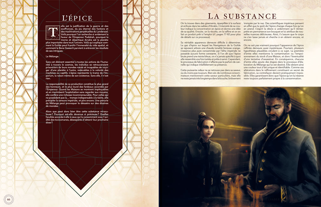 L’épice représente tout. Pour certains, elle allonge l’espérance de vie et confère à d’autres des visions de l’avenir. Clé de la richesse et du pouvoir dans l’Imperium, nombre de Maisons Nobles tenteront l’impossible pour la contrôler totalement. Les cités d’Arrakeen et de Carthag grouillent d’agents et d’espions qui cherchent à prendre l’avantage au nom de leur faction, et ils n’hésiteront pas à tuer pour préserver l’influence de leurs maîtres. Vos personnages prouveront-ils la supériorité de leur Maison sur Arrakis, ou bien leur sang viendra-t-il abreuver les sables implacables ?